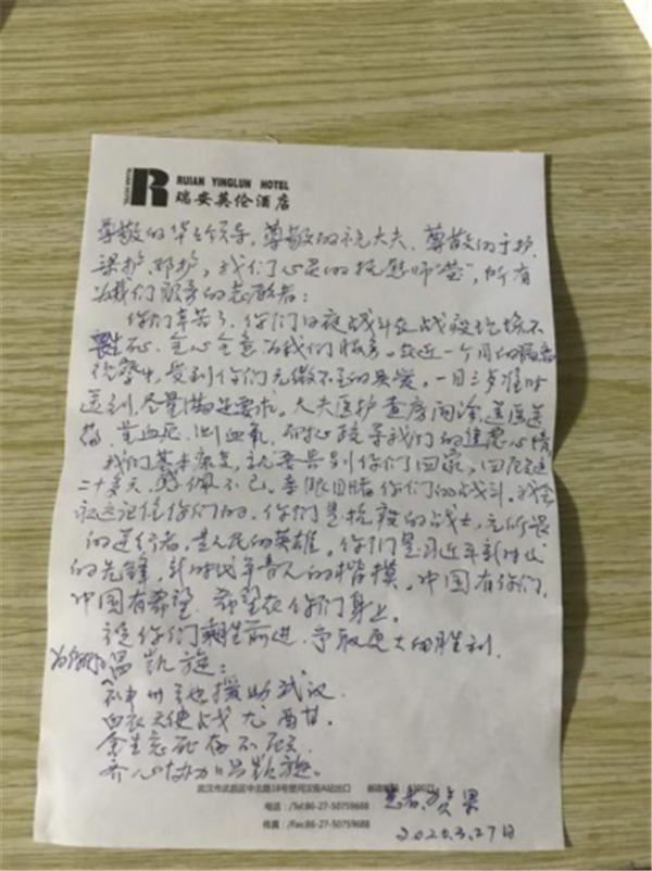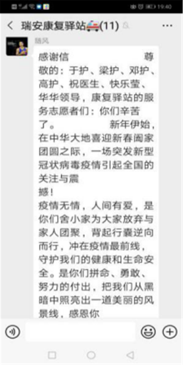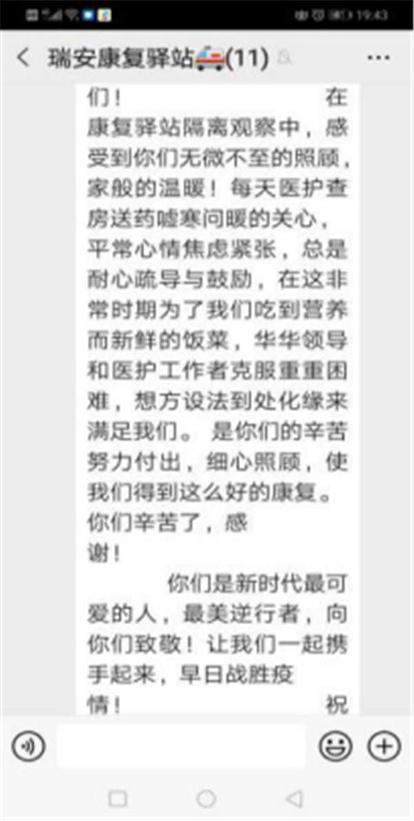 瑞安英伦酒店康复驿站从2月18日筹建运行至闭站,共接收82名轻重症康复人员和医学观察人员。在这42天里,省统计局工作组带领12名工作人员24小时坚守岗位,每天工作时长18小时以上,为患者痊愈回归家庭和社会,提供“最后一公里”的保驾护航。工作组3名同志,克服家庭困难,无惧感染风险,不计个人得失,勇挑重担,加班加点,夜以继日,奋战一线。他们发扬军转干部的战斗精神和军人本色,服从命令,听从指挥,敢打硬仗,不讲条件,高标准、严要求完成各项工作。隔离人员中,年龄最小的才6岁,年龄最大的77岁,工作组视他们为亲人,细致周到,精心服务,让隔离人员感受到家庭般的温暖,一封封感谢信的背后,都书写出他们的辛勤付出。