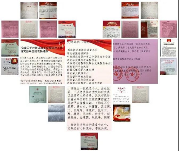 总队机关重点支援的三个社区中,武昌区杨园街建设新村社区向总队赠送了“情系群众牢记使命,担当有为共战疫情”的锦旗,向10名工作组成员颁发纪念证书;汉阳区江堤街汉博佳园社区向总队赠送了“不畏疫情心系群众,服务为民坚守初心”的锦旗,向8名工作组成员颁发纪念证书和表扬信;武昌区水果湖街道办事处洪山路社区党委印发《关于对新冠肺炎疫情防控工作表现突出单位的表扬通报》,总队获评“新冠肺炎疫情防控工作表现突出单位”,8名同志获评“新冠肺炎疫情防控工作表现突出的驻点单位优秀党员志愿者”。