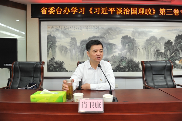 为推动落实党员干部学懂弄通做实习近平新时代中国特色社会主义思想,9月15日上午,省委台办邀请省委党校肖卫康副校长对《习近平谈治国理政》第三卷进行专题辅导。会议由李建红主任主持。