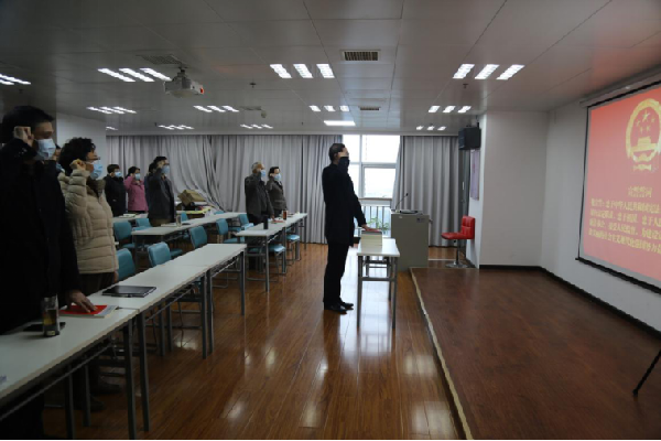 陈波领诵誓词,全体干部职工跟诵誓词。