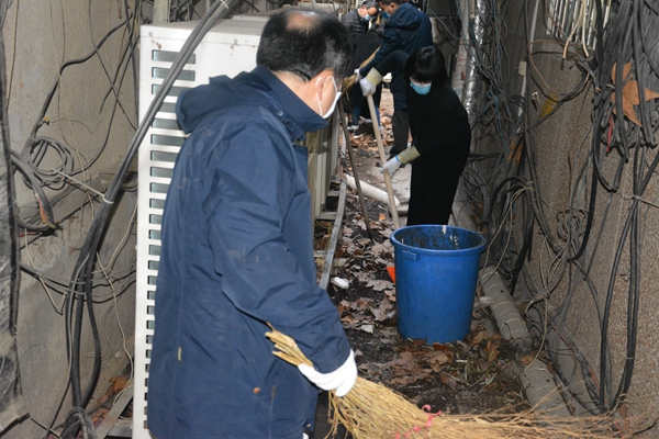 随后,全办干部职工以支部为单位赴各自服务区域展开志愿服务活动。陈汉华副主任带头清理门栋“牛皮藓”,打扫蜘蛛网,擦拭楼梯扶手。出国来华管理处负责清理楼间夹巷,该区域空间狭长,阴暗潮湿,散落的树叶、垃圾较多,是多年的卫生死角。该处干部职工在处长侯继文的带领下,一点一点的将垃圾抠出装袋,并将杂乱的电线、管道清理顺畅。其他干部职工在打扫路面、清理花坛杂物时,全然不顾灰尘扑鼻,异味难闻,许多同志的衣服、鞋子都弄脏了。经过两个多小时的奋战,外办家属楼小区和办公区域的环境焕然一新,大家看到自己的劳动成果,露出了满足的笑容。