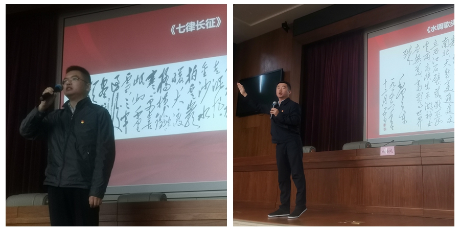 政研室何江海同志朗诵了英雄史诗《七律·长征》,和大家一起体会革命时期红军战士不畏艰险、不惧强敌的大无畏战斗精神和无往不胜的豪迈情怀;省委网信办综合处周来来朗诵了毛泽东在武汉畅游长江写下的《水调歌头·游泳》,带大家共同感受社会主义建设时期中国人民建设祖国改变山河的豪迈气概。