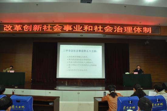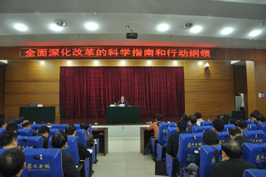 11月21日,省委党校举办学习党的十八届三中全会精神辅导报告会,常务副校长陶良虎教授、原常务副校长马哲军教授、公共管理教研部主任孙大敏教授和政法教研部主任赵静教授分别作了题为《经济体制改革的路线图与任务书》、《全面深化改革的科学指南和行动纲领》、《改革创新社会事业与社会治理体制》、《以法治精神深化改革 打造法治中国》专题辅导讲座。全校教职工和主体班学员参加了全天的学习辅导。