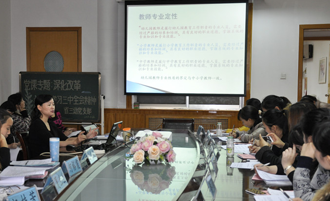 2013年11月26日——30日为省直机关第三幼儿园园本培训活动周。为了进一步促进教师专业发展,打造一支师德高尚、作风优良、业务精湛、充满活力的高素质教师队伍,11月27日,省三幼在园务会议室开展了《幼儿园教师专业标准》专题培训活动。活动由省三幼保教园长金锦秀主讲,保教主任龚耘播、周韵、杨莉、程香和全体教师参加了本次培训活动,活动还特邀了在省三幼跟岗实践研修的骨干教师们。