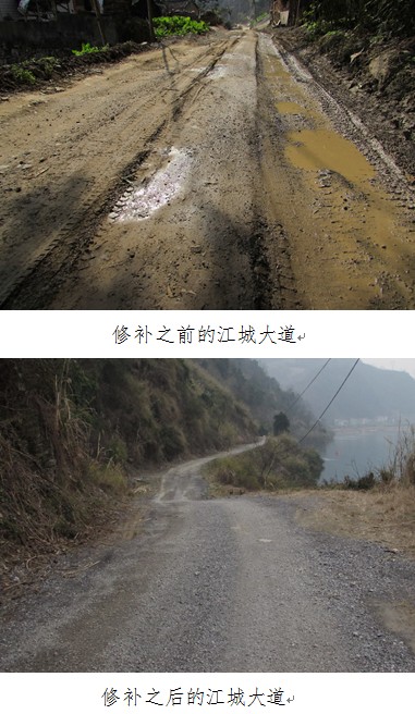 自“三万”活动开展以来,工作队就一直关注驻点村村民的生活与发展。据悉,何家坪村的江城大道是该村村民出行的主要道路之一,但是由于该道路是毛坯路,加上年久失修,路面已经坑坑洼洼,泥泞不堪,严重影响了村民们出行。该道路全长6.6km,为县级规划道路,原定于今年下半年对该道路进行改造,但是由于春节临近,外出打工的村民开始大量返乡,早已不堪重负的路面更加难以通行。工作队了解该情况后,协助何家坪村村委会,拨出专项资金,对江城大道的路面进行了修补。修补后的江城大道路面平整,行人和小车均可通行,为村民进出提供了方便,也为下一步的江城大道改造工程打好了基础。
