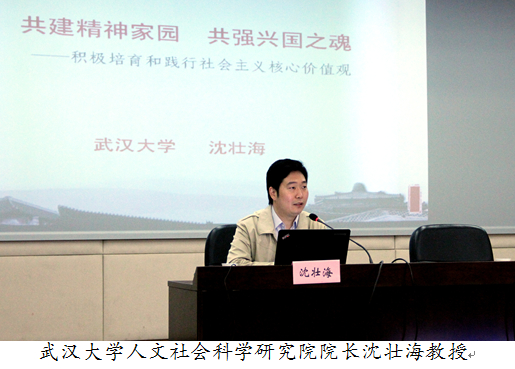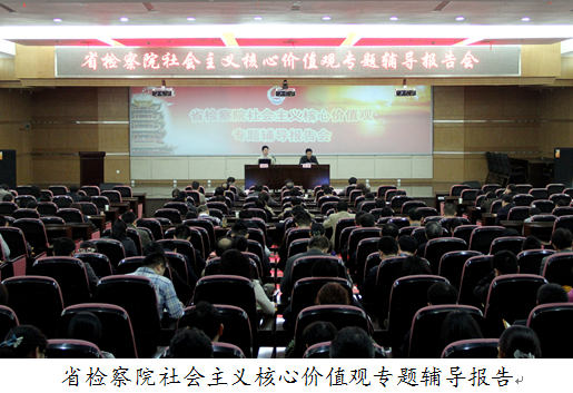 根据中央、省委有关要求和省院工作安排,省检察院机关认真组织开展学习习近平总书记系列重要讲话精神专题教育活动。4月18日上午组织了第一场报告会,邀请武汉大学人文社会科学研究院院长沈壮海教授围绕培育和践行社会主义核心价值观主题,为省院机关及汉江分院、武汉铁路检察分院干警作了专题辅导报告。沈教授从“纵深推进民族复兴的战略举措,构建国人精神家园的核心命题”的战略高度,以《共建精神家园 共建兴国之魂》为题,从为什么要建设社会主义核心价值观、如何理解社会主义核心价值观、如何培育践行社会主义核心价值观等三个方面,从古至今、从国外到国内全面阐释了社会主义核心价值观的基本内容、理论精髓和精神实质。