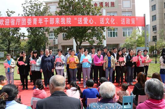 上午,青年干部来到团风县光荣院、儿童福利院开展“送爱心、送文化、送政策”活动。活动中,机关团委书记曹红代表省民政厅向光荣院、儿童福利院赠送了5万元慰问金。青年干部自己出资为每一位老人、儿童送上了一份“爱心礼物”。青年干部和光荣院、儿童福利院的工作人员一起,为老人们自编、自导、自演了一台小节目,并开展了民政政策咨询。整个现场欢声笑语、掌声不断,光荣院的老人们、儿童福利院的孩子们都非常高兴,一位84岁高龄的老人还即兴为民政厅机关团委写了一幅字。