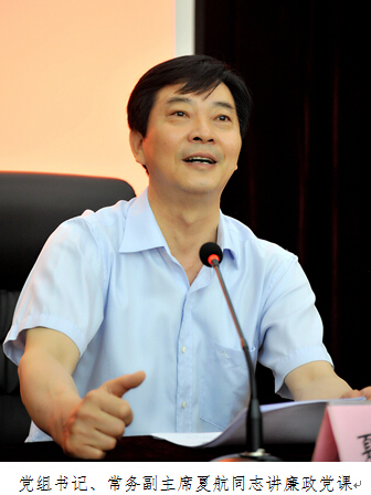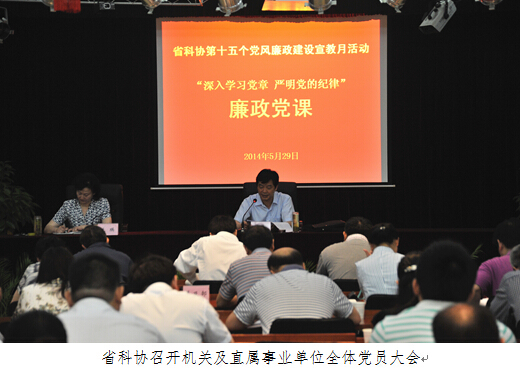 上午,省科协召开机关及直属事业单位全体党员大会,党组书记、常务副主席夏航同志以《以党章为镜 以党纪为绳 永葆共产党人本色》为题,为全体党员作廉政党课辅导,党组成员、纪检组长朱瑛同志主持会议。