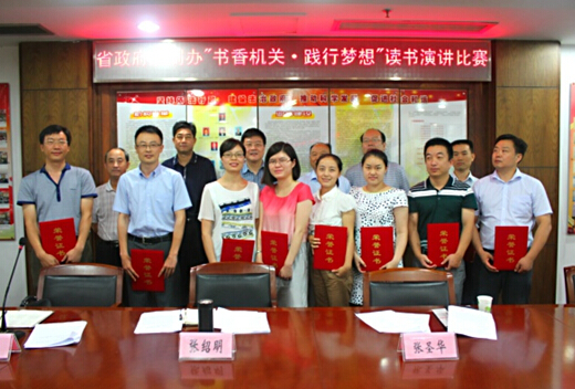 7月1日,省政府法制办举办“书香机关•践行梦想”读书演讲比赛。9名优秀选手分别代表各处室参加比赛,经激烈角逐,评委现场打分,吴飞飞荣获一等奖;熊凡凡荣获二等奖;姚婷、姚荣荣获三等奖;程之凡、金安祠、朱运伟、李博、张新兵荣获优秀奖。