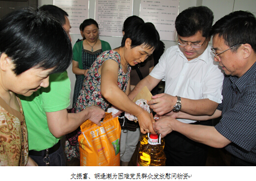 6月30日下午,省国资委党委书记、主任文振富,委党委委员、纪委书记、机关党委书记胡逢潮带领办公室、宣传处、机关党委、后勤中心党支部代表到北环社区慰问困难党员群众。北环社区总支书记王凤对省国资委到北环社区慰问表示欢迎和感谢,同时介绍了在职党员到社区报到为群众服务工作的情况,肯定了省国资委前期配合社区所做的相关工作。文振富代表省国资委向社区困难党员群众表示慰问,让大家感受到党的温暖,并表示委机关要进一步发动在职党员献爱心,把好事办好,把工作做实,形成长效机制,不断改进机关作风,密切党群干群关系。