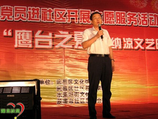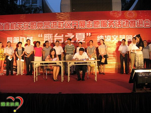 7月9日晚7时,放鹰台社区党总支在水果湖步行街举办“省直机关在职党员进社区开展志愿服务活动推进会”暨“第九届鹰台之夏”文艺演出,我办党组成员、副主任、机关党委书记张杰,机关党委专职副书记温霖带领相关工作人员赴社区积极参加志愿服务活动。在活动现场,张杰副主任与放鹰台社区黄海燕书记共同签订了《放鹰台社区与辖区单位在职党员开展志愿服务活动协议书》,并作表态发言,他表示,在职党员进社区开展志愿服务活动,对于促进党的群众路线教育实践活动深入开展,对于机关党员密切联系群众,对于社区党建和精神文明建设都具有十分重要的意义,开展志愿服务活动,对于社区基层党组织建设和机关党组织建设都将起到很大的推动作用,省扶贫办将按照签订的协议书要求积极参加社区的各项活动,为社区党建和精神文明建设作出应有的贡献。