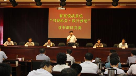 7月21日下午,省直统战系统“书香机关•践行梦想”读书演讲竞赛在省社会主义学院举行。省委统战部常务副部长盛国玉出席活动并讲话;省委统战部纪检组长、直属机关党委书记刘平安,省委统战部副部长、省社院党委书记马萍,省委统战部副部长冯艳飞,省委统战部秘书长杨声驰,省工商联副主席赵斌,省社会主义学院副院长杨建国、申亚力,省中华职教社专职副主任田社清,省民主党派大院行管办主任张林冀,省黄埔同学会秘书长李志康,省社会主义学院副巡视员孟江陵,省工商联党组成员、秘书长罗绍友,省台联副会长兼秘书长罗鹰,省直机关团工委书记杨宗艳,省直机关工会副调研员侯礼平出席,省直统战系统200余名党员干部参加活动。