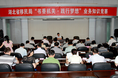 为认真贯彻落实省委“竞进提质•升级增效”总要求和省直机关工委《关于印发〈省直机关2014年“全民阅读•书香机关”读书活动实施方案〉的通知》、省直机关工会工作委员会《关于转发省劳动竞赛委员会〈关于广泛深入开展“建成支点当主力、走在前头立新功”劳动竞赛活动的意见〉的通知》精神,进一步提升机关干部政治思想水平和业务工作能力,省移民局在组织开展“书香机关•践行梦想”读书演讲竞赛活动的基础上,7月25日组织机关全体干部进行了岗位业务知识竞赛。