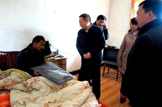 在调研中,室调研组慰问了全村5户特困家庭,了解他们在生产、生活中遇到的实际困难,鼓励他们树立信心,努力克服暂时困难,积极搞好生产生活,并分别为每户特困家庭送去了过冬的新棉衣1件、大米1袋和食用油1桶。失独特困户孙楚元体弱多病,躺在病床上接过慰问品,眼泪止不住往下流,一个劲握着梅学书同志的双手,不停地说感谢党、感谢政府。