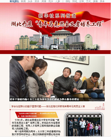 12月27日,新华每日电讯头版头条报道我省“青年马克思主义者培养工程”,新华网同时开设专题页面,对该活动进行系列报道,以大量生动详实的文字、图片和影像资料介绍了此项工作的进展情况和学员学习成长的收获。部分报道内容如下: