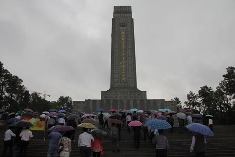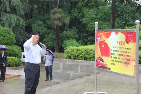 风雨交加,电闪雷鸣,苍天怒吼,怅然泪下。机关党员干部在纪念碑广场前整齐列队,两名党员代表向纪念碑敬献花圈,委党委副书记、副主任傅立民上前整理挽联,每个党员庄严肃穆,向革命烈士纪念碑深深三鞠躬。接着,大家重温入党誓词,由委党委委员、副主任胡铁军领誓,全体党员高声跟着宣誓,在革命烈士纪念碑前再次表达了对党的绝对忠诚。