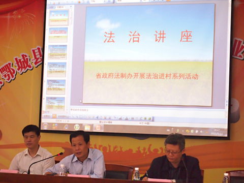 二、举办法治讲座,提高法治能力。5月13日,在鄂州市蒲团乡政府组织乡村所有干部、村律师顾问、各村组长及网格员近200人开展法治辅导讲座。办“三万”工作组带队领导、办副主任魏月明同志作《贯彻落实四中全会精神,推进基层依法治理》辅导讲座;邀请省农业厅经管局副局长王钢作《中共中央办公厅、国务院办公厅<关于引导农村土地经营权有序流转发展农业适度规模经营的意见>解读》辅导讲座。在讲座后并就乡村干部有关提问开展互动,解答了乡村干部群众最关心的热点、难点和困惑的问题。通过开展法治辅导讲座和互动,提高了乡村干部、村组长和网格员办事依法、遇事找法、解决问题用法、化解矛盾靠法和运用法治思维和法治方式化解群众纠纷和解决问题的能力。