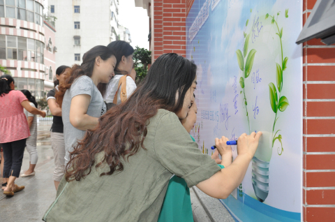 “节能有道,节俭有德,低碳城市,宜居可持续······”节能宣传周开启活动在袁芒园长声情并茂的演讲中拉开了序幕,之后大家畅所欲言,积极的提出自己关于节能节俭方面的意见和建议。最后,大家都来到新教学楼前,在本次节能宣传周签名墙上留下了自己慎重的一笔,为本次开启活动画上了完美的句号。