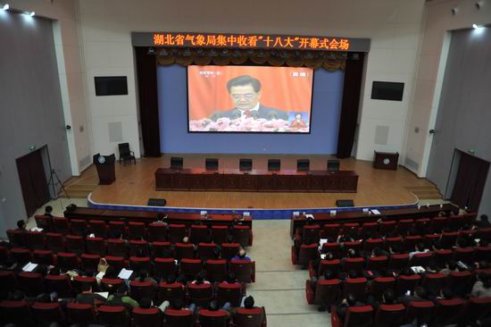 2012年11月8日,中国共产党第十八次全国代表大会在北京胜利开幕。上午九点,省气象局党组全体成员、局直各单位近300名党员干部一起集中收听收看了党的十八大开幕式盛况,认真聆听了胡锦涛总书记所作报告。