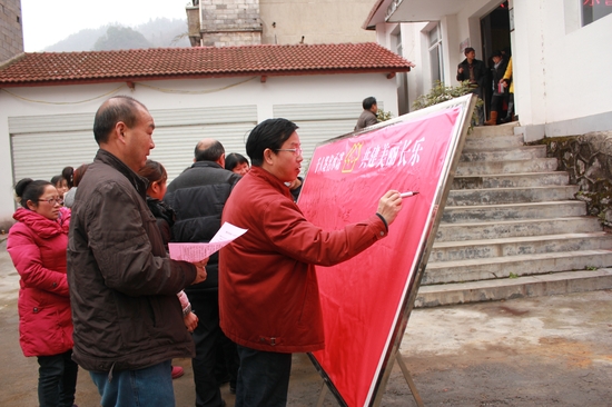为把新一轮“三万”活动阶段性工作进一步引向深入,省民宗委“三万”活动工作组在前期走村串户宣传党的十八大和省第十次党代会精神,倾听民意民声、了解民愿民盼,组织实地调研征求镇村意见的基础上,于12月19日在五峰土家族自治县长乐坪镇组织4个驻点村开展了“千人签名承诺 共建美丽长乐”活动,该委副巡视员、“三万”活动工作组领队段绪光亲自组织教育动员。