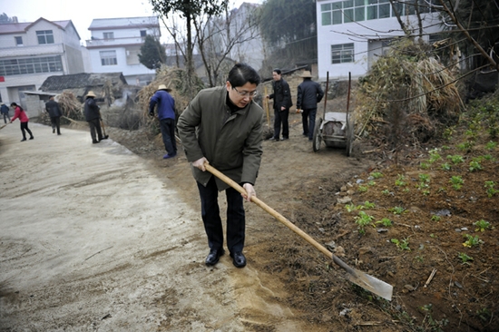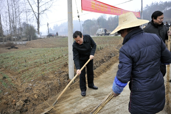 2013年1月21日,正值寒冬腊月,省法院“三万”活动工作组一行在党组副书记、副院长张传读,党组成员、政治部主任田昌兵带领下,冒着细雨到英山县方家咀乡伯仲桥村开展“三万”活动。工作组与村民们一起清理道路,商讨村容整治方案,看望慰问老党员和困难群众,将党的关怀和温暖送到偏远山村。