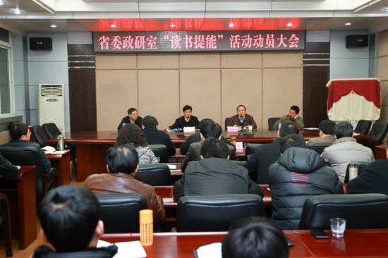 2月17日下午,省委政研室召开全室干部职工大会,传达贯彻全省“学习贯彻十八大、争创发展新业绩”主题实践活动电视电话会议、省直机关“三抓一促”动员会议精神,并对室机关开展“读书提能”活动进行了动员部署。