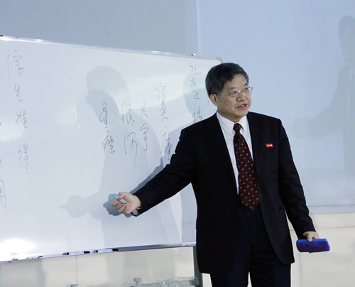讲座中,程教授一人、一笔、一板抒写千年风雅,信手拈来诗词典故,寓理于赏析,在古典诗歌中浸透着人文精神,给人以深刻的教益。他富有深意地说,人的一生会有三个母亲,一个母亲给了我们身体并养育我们长大,一个母亲给予我们教育让我们明理,还有一个母亲塑造我们的精神,给了我们尊严。在热爱国家和人民、孝敬父母、教育子女、看待困难等方面,程教授都留下了许多精彩的语录。