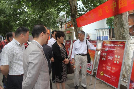 这是5月10日上午《学习十八大、创新谋发展》大型社科普及巡回展览上发生的一幕。活动由省社科联主办、省创新研究会承办、水果湖街办事处协办,此次位于水果湖步行街的展览是巡展的第一站。省社科联党组书记曾婕、分管科普工作的副主席杨增能和其他班子成员周庆章、杜绍祥、温健出席了此次活动。
