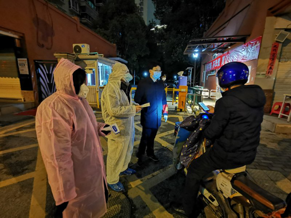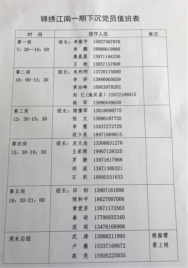 坚持党建引领,整合工作力量。社区下沉党员来自不同的行政机关、企事业单位,大家工作热情都很高,但相互不熟悉,有时会觉得找不到组织、工作归属感不强。为了增强下沉党员的凝聚力,省委政法委机关认真履行牵头单位责任,提议在社区抗疫一线建立临时党组织,得到水果湖街道党工委、滨湖社区党委的大力支持。2月28日,经水果湖街道党工委下文批准,滨湖社区下沉党员临时党支部正式成立。省委政法委机关党委专职副书记陈燕华任临时党支部书记,水果湖街人大主任吴江、省委政法委机关纪委书记张劲松、省委政法委机关工会主席童祥生任副书记。在社区党委报到的省文化和旅游厅二级巡视员刘晗、省委组织部干部教育处二级主任科员郭维、省委办公厅法规室副主任二级调研员田钧等7名居民小区区长为党支部委员,省委政法委工作队员陈小斌、向慧分别担任纪检委员和组织委员,7名小区区长同时担任党小组长,负责各小区党员志愿者管理工作。每个楼栋设一名楼栋长,由1—2名党员包保一个楼栋,负责该楼栋日常排查和居民服务工作。通过“支部+党小组+党员”呼应“社区+网格员+小区区长+楼栋长”的模式,将下沉社区95名党员明确到抗疫一线,为在疫情防控工作中发挥支部战斗堡垒作用和党员先锋模范作用奠定组织基础。