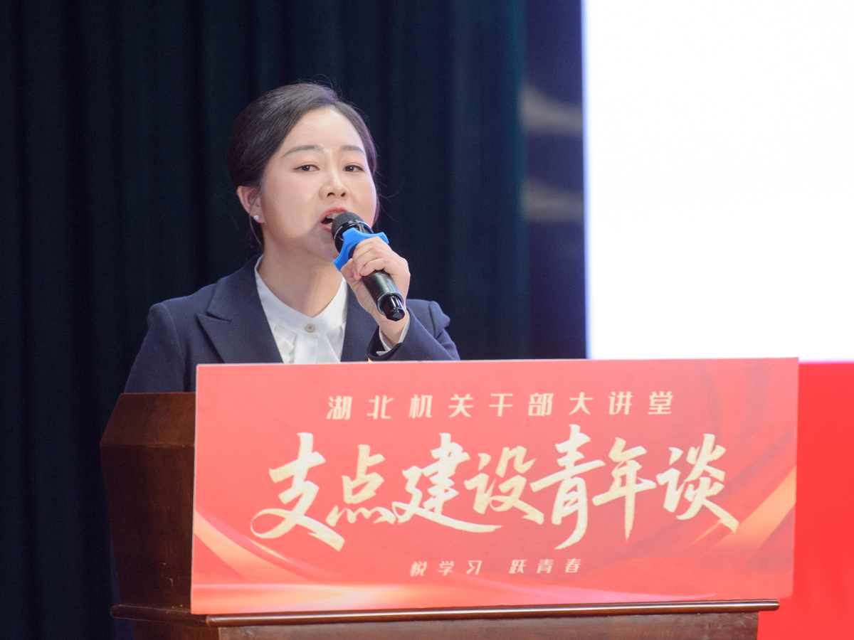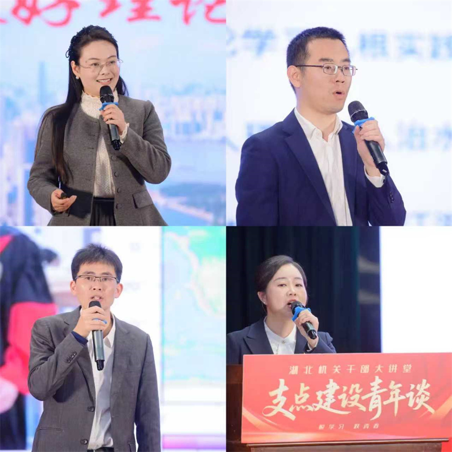 四位来自不同领域的优秀青年代表分享了他们的成长故事和奋斗历程。湖北省三八红旗手、湖北向上向善好青年获得者、省委直属机关工委党校副教授魏长仙,以深入浅出的语言阐述了如何让党的创新理论“声”入人心,成为连接政策与群众的“翻译者”与“播种人”。2025年度省直机关支点建设青年先锋获得者、省水利水电科学研究院水资源研究所所长王敬,结合水利科研实践,分享了在水资源优化配置与调度研究中守护江河安澜、服务现代水网建设的探索与思考。2025年度湖北青年五四奖章获得者、省地震局武汉地球观测研究所副所长胡敏章,立足防震减灾一线,讲述了通过高精度观测与科研攻关将论文写在大地上、用科技守护山河安澜的奋斗历程。2025年度湖北青年五四奖章获得者、2024年度中国式现代化湖北实践青年先锋、湖北省妇幼保健院妇科主治医师冯春,从医者视角出发,分享了在妇科肿瘤防治、生殖健康等领域的临床创新与科研突破,并带领青年医务工作者重温医学生誓言,生动诠释“医者仁心”与“科研报国”的融合担当。
