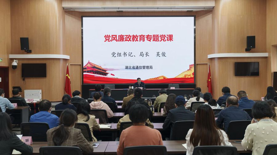 为持续推动落实全面从严治党主体责任,强化党风廉政教育,近日,湖北省通信管理局组织召开警示教育大会,集中观看警示教育片,会上,局党组书记、局长吴俊讲授廉政专题党课,以案为鉴、以案促改,进一步提高党员干部职工遵规守纪的意识和拒腐防变的能力,教育引导党员干部职工心有所畏、言有所戒、行有所止,坚守政治责任和担当,高质量推进全面从严治党向纵深发展。大会由局党组成员、纪检组长、机关党委书记付景广主持。局机关全体党员干部职工,省通信行业协会、省互联网协会秘书处全体人员,对口联系紫菘社区党总支书记等参加会议。