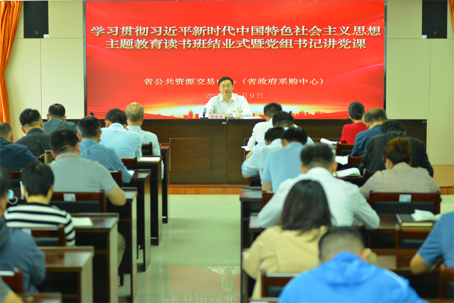 5月9日下午,省交易(采购)中心举行学习贯彻习近平新时代中国特色社会主义思想主题教育读书班结业式暨党组书记讲党课,党组书记、主任胡俊明主持结业式,党组成员、副主任孙咏平、张洪泽,二级巡视员,总经济师以及全体党员干部参加。