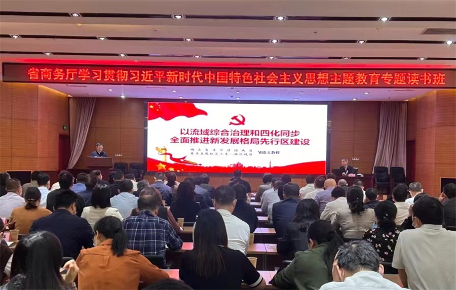 邹德文围绕学习贯彻党的二十大精神,突出推动高质量发展这个首要任务和以中国式现代化全面推进中华民族伟大复兴这个中心任务,紧扣“以流域综合治理和四化同步全面推进新发展格局先行区建设”这个主题,阐释了治荆楚为什么要先治水,流域治理和发展底图是什么,推动发展需要牢牢守住的四条安全底线,推进四化同步发展需要把握的重点任务,完善四大支撑体系的目标任务,以及如何凝聚建功先行区的强大合力。辅导报告主题鲜明、内容丰富,为以商务所能服务湖北所需、在努力建设全国构建新发展格局先行区跑好商务这一棒提供了思维支撑和思路支持。