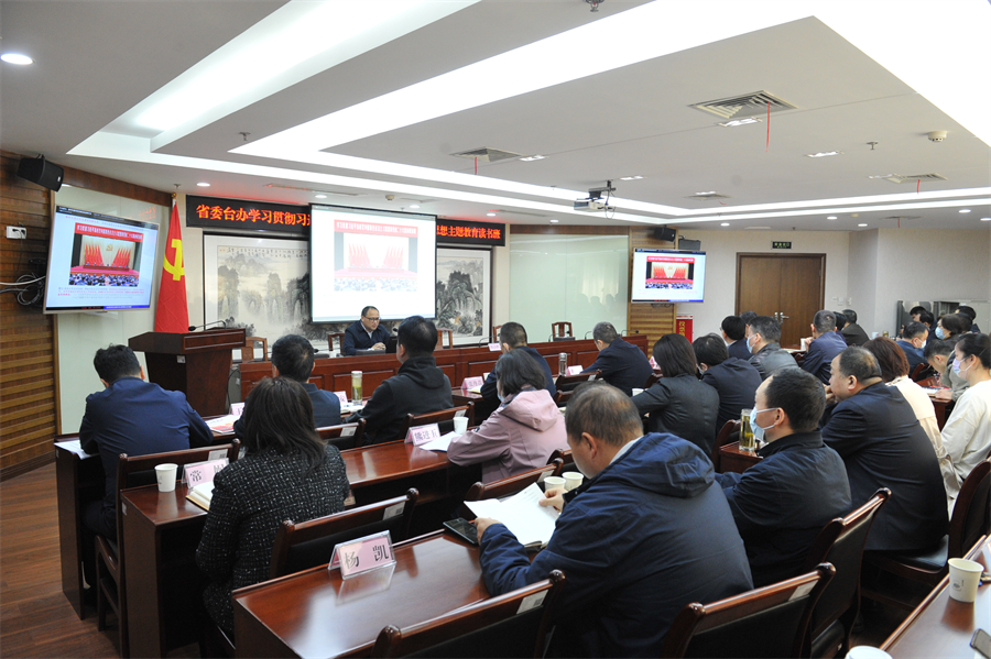 5月12日,省委台办学习贯彻习近平新时代中国特色社会主义思想主题教育读书班结业,办主任程良胜作总结讲话,全办党员干部参加活动。