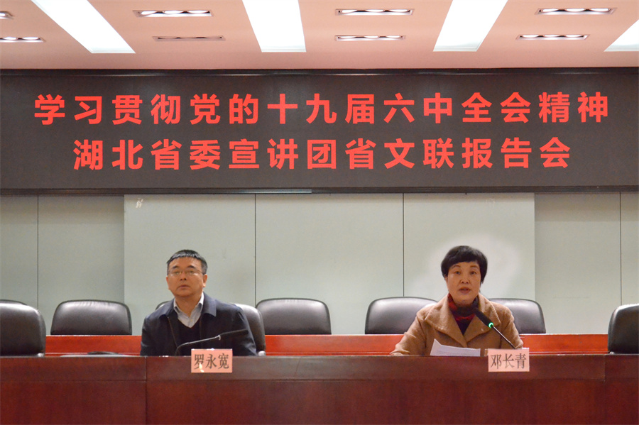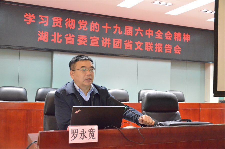 按照省直机关党史学习教育办公室统一部署,12月7日上午,党的十九届六中全会精神宣讲报告会在省文联举办。省委讲师团成员、武汉大学马克思主义学院党委书记、教授罗永宽作宣讲报告。省文联党组书记、常务副主席邓长青,党组成员、副主席、一级巡视员肖伟池,党组成员、副主席王永平,党组成员、秘书长、二级巡视员雷波,二级巡视员李建华出席,省文联全体干部职工、今古传奇传媒集团各企业负责人和业务主管社会党组织支部书记共100余人聆听了报告。
