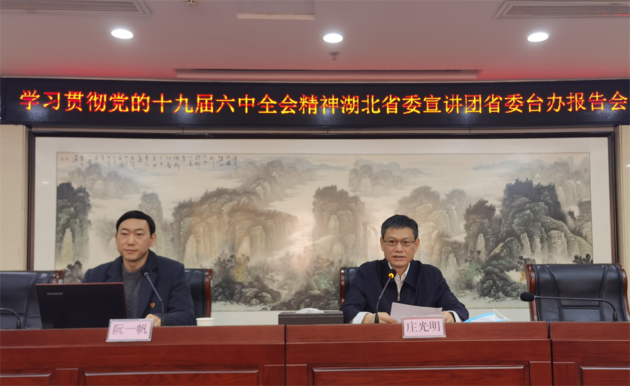 12月9日,为深入学习贯彻党的十九届六中全会精神,切实把干部职工的思想和行动统一到全会精神上来,省委台办举行学习贯彻党的十九届六中全会精神宣讲报告会,主任庄光明主持并讲话。省委宣讲团成员、中国地质大学(武汉)马克思主义学院院长阮一帆作题为《在新的赶考路上创造新的辉煌》专题辅导授课。省委台办办领导班子成员、部分退休老干部和全体干部职工参加了会议。