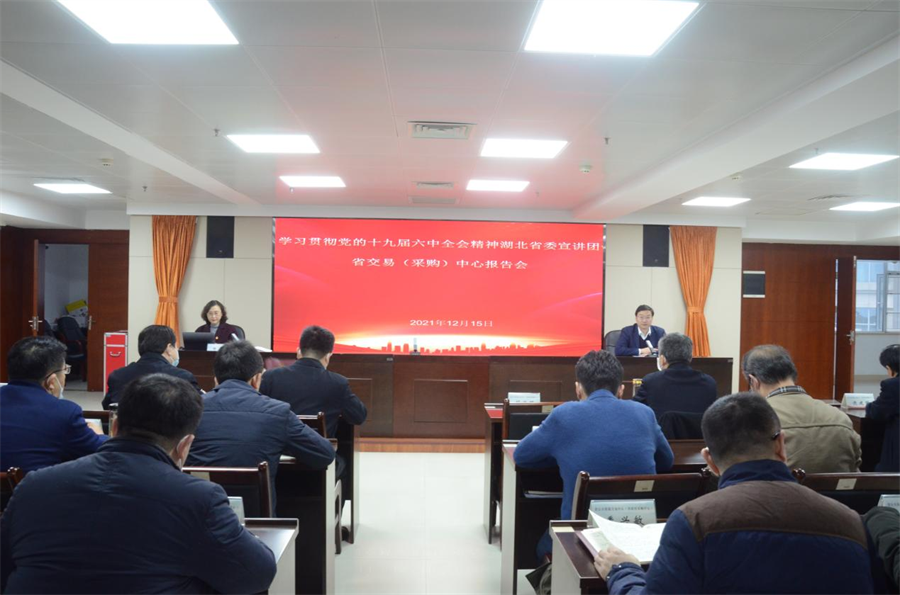 胡俊明在主持宣讲报告会时强调,全体党员干部要进一步提升思想认识、提高政治站位,把学习贯彻党的十九届六中全会精神作为当前和今后一个时期的重要政治任务,坚决把思想和行动统一到习近平总书记重要讲话和十九届六中全会精神上来;要把学习贯彻全会精神与做好交易采购服务工作结合起来,与深化平台整合共享结合起来,与优化招投标和政府采购环境、推进“十大工程”项目招投标工作结合起来,与对照年度重点目标任务结合起来,与做好省委第九轮巡视“后半篇文章”结合起来,与党史学习教育“我为群众办实事”结合起来,努力把学习贯彻全会精神转化为干事创业的强大动力;要坚持以思想破冰引领发展突围,谋定快动,担当实干,积极稳妥推进交易采购领域改革,持续优化交易采购环境,不断提高交易采购质效,为推动我省经济社会高质量发展、加快推进“建成支点、走在前列、谱写新篇”做出新的贡献,以优异成绩迎接党的二十大和湖北省第十二次党代会召开。