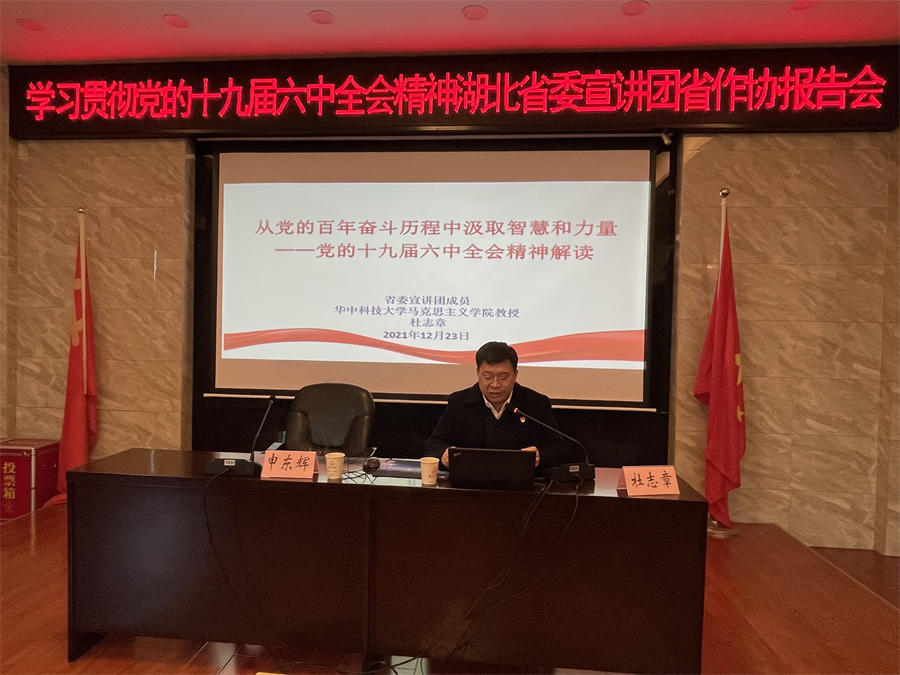 12月23日上午,读书班举办“学习贯彻党的十九届六中全会精神湖北省委宣讲团省作协报告会”,省委宣讲团成员、华中科技大学马克思主义学院教授杜志章作专题宣讲。杜志章以《从党的百年奋斗中汲取智慧和力量——党的十九届六中全会精神解读》为题,深刻讲解了党的十九届六中全会的两个重大意义、两项重大成果,重点从“全党要牢记的一个根本问题”、“两个确立”的决定性意义、党的理论创新的三次飞跃、党百年奋斗的四个阶段及重大成就、党百年奋斗的五大意义和党百年奋斗的十条经验等六个方面,详细解读了《中共中央关于党的百年奋斗重大成就和历史经验的决议》的主要内容。报告主题鲜明、条分缕细、脉络清晰、内容丰富、论证精辟、视野开阔,为省作协党员干部深入理解党的十九届六中全会精神、深刻领悟《决议》的思想伟力、丰富内涵和核心要义,汲取党的百年奋斗历程的智慧和力量提供了精神支撑和学习方向。