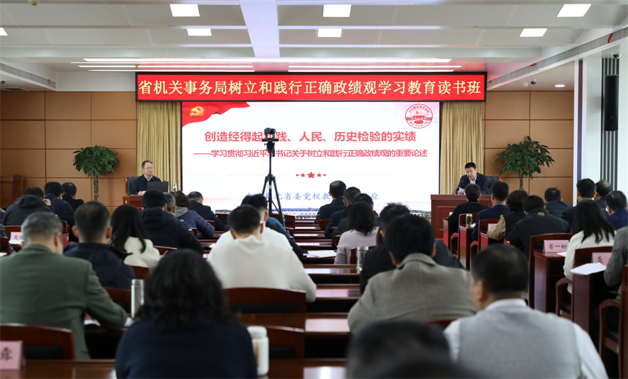 本次读书班邀请中共湖北省委党校王能应教授作专题辅导授课,围绕《创造经得起实践、人民、历史检验的实绩》主题,从“充分认识树立和践行正确政绩观的重要意义”“全面把握树立和践行正确政绩观的丰富内涵”“健全有效防范和纠治政绩观偏差的工作机制”“我省贯彻落实‘树立和践行正确政绩观’的工作部署和要求”四个方面,系统梳理、深入阐释、精准解读了习近平总书记关于树立和践行正确政绩观的重要论述精神。