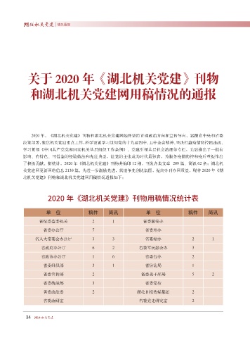 了积极贡献。据统计,2020 年《湖北机关党建》刊物共编印 12 期,刊发各类文章 209 篇、简讯 62 条;湖北机