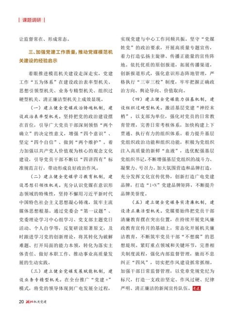 硬型机关、清正廉洁型机关上成效显现。 (四)建立健全党媒能力强基机制,建