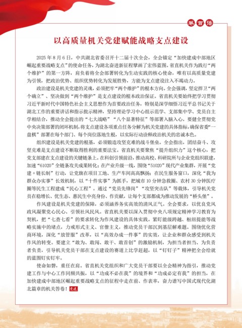 崛起重要战略支点”的使命任务,为湖北奋进新征程擘画了宏伟蓝图。省直机关作为践行“两