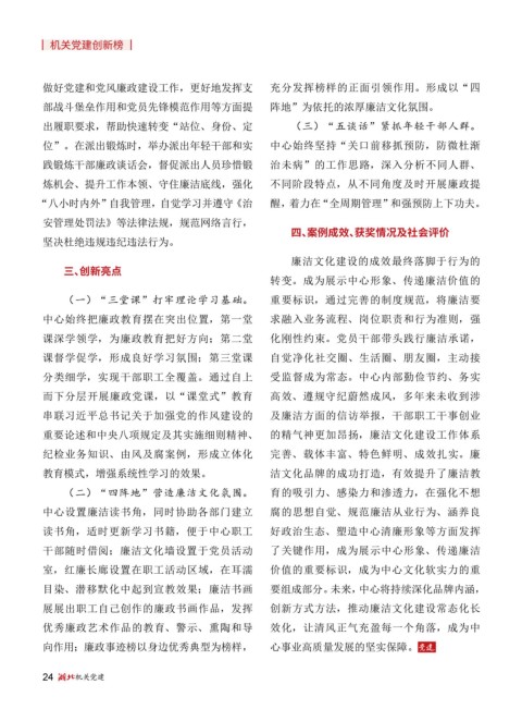 部战斗堡垒作用和党员先锋模范作用等方面提 阵地”为依托的浓厚廉洁文化氛围。