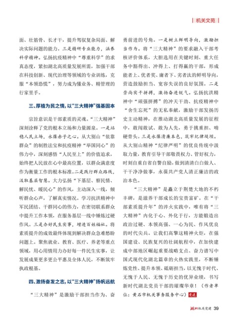 宗旨意识是干部素质的灵魂。“三大精神” 史主动精神,在推动湖北高质量发展的征程