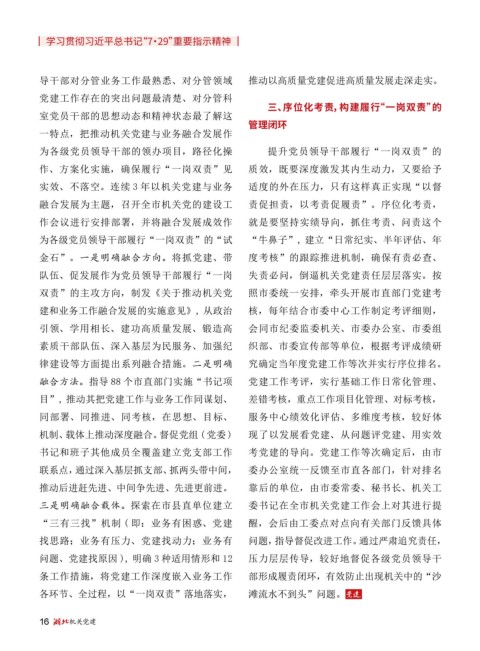 条工作措施,将党建工作深度嵌入业务工作 部形成履责闭环,有效防止出现机关中的“沙
