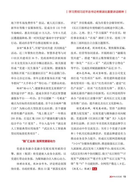擎。报社(集团)将党建嵌入业务全流程,以 《武汉宣传》两个协同圈层,做大“长江财经”“37