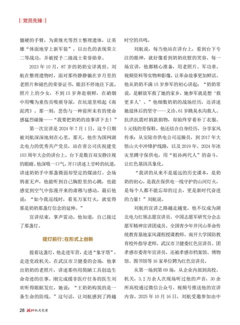 2023 年 10 月,87 岁的奶奶安详离世。刘 场宣讲,他都精心准备,用老照片、军功章、