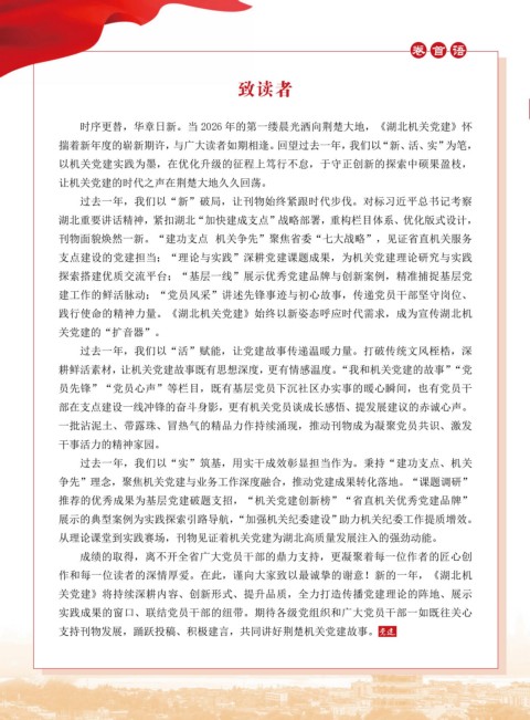 时序更替,华章日新。当 2026 年的第一缕晨光洒向荆楚大地,《湖北机关党建》怀