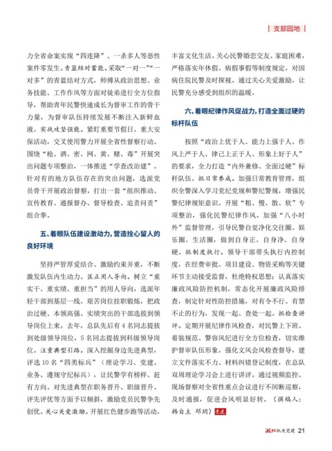 导岗位上来。去年,总队先后有 4 名同志提拔 评。定期开展纪律作风检查,对民警上下班、
