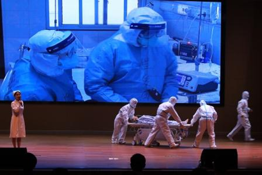 舞台正在呈现的是去年疫情肆虐期间,宜昌“战疫”最前线——宜昌市三医院医护人员冲锋陷阵的一个场景。过去场景历历在目,现场观众无不动容。
